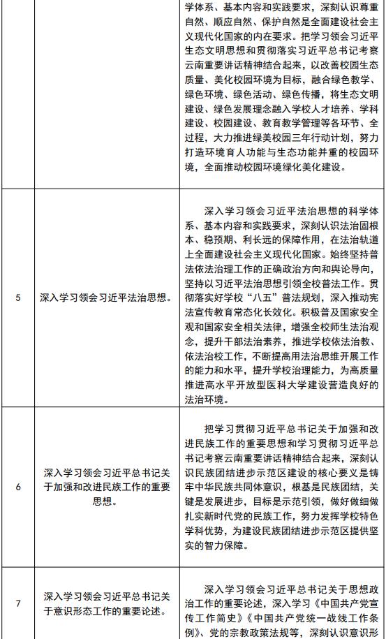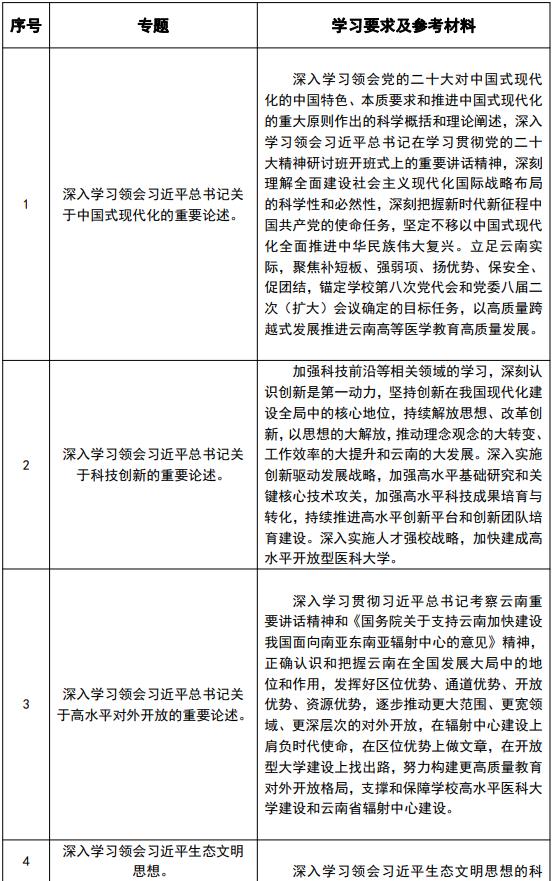 2023年是全面贯彻落实党的二十大精神的开局之年,推进理论武装、加强师生政治理论学习至关重要。为深入学习贯彻习近平新时代中国特色社会主义思想和习近平总书记考察云南重要讲话和重要指示批示精神,贯彻落实《中共云南省委办公厅关于印发〈省委理论学习中心组2023年学习选题计划〉的通知》及《新利·(中国)集团有限公司,2023年校院两级党委理论学习中心组学习计划暨学习型党组织学习安排意见》(昆医大党宣字〔2023〕2号)要求,结合直属单位党委实际,现就2023年直属单位党委学习型党组织建设工作安排如下: