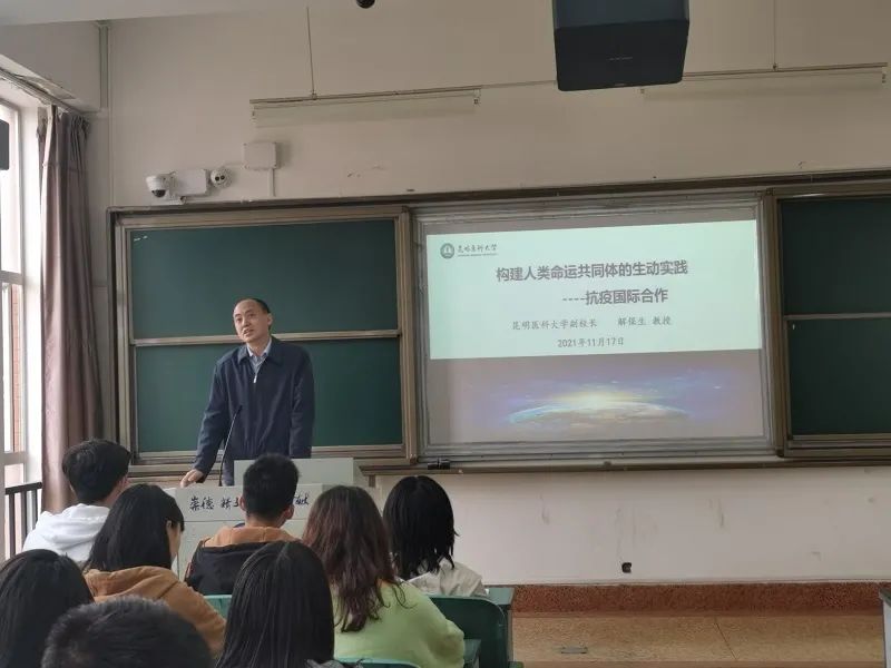 11月17日上午,学校副校长解保生教授走进教学一线,在呈贡校区6307教室为2021级临床医学十五大班同学讲授以“构建人类命运共同体的生动实践——抗疫国际合作”为主题的《形势与政策》课。